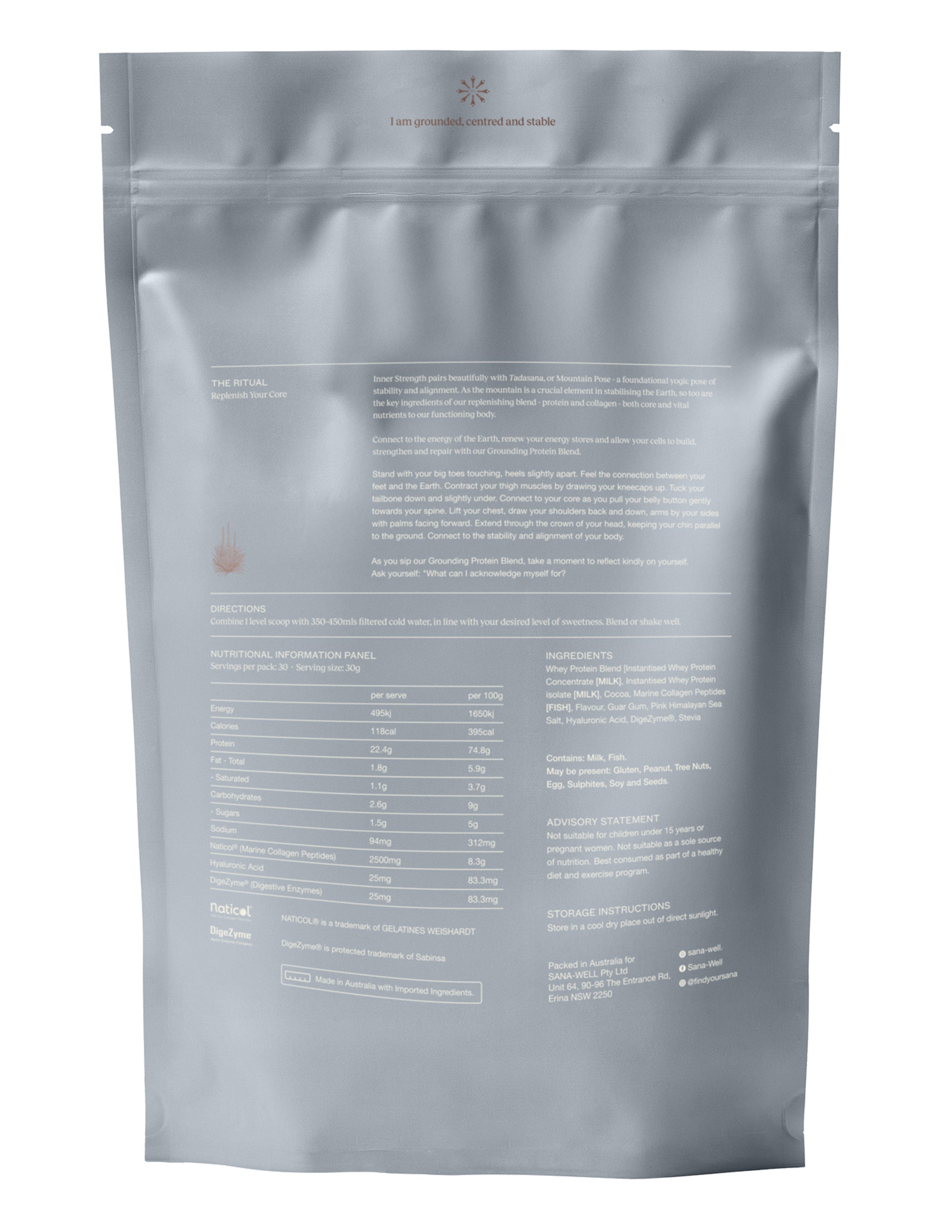 Our Grounding Protein Blend pairs beautifully with Tadasana, or Mountain Pose - a foundational yogic pose of strength, stability and alignment.